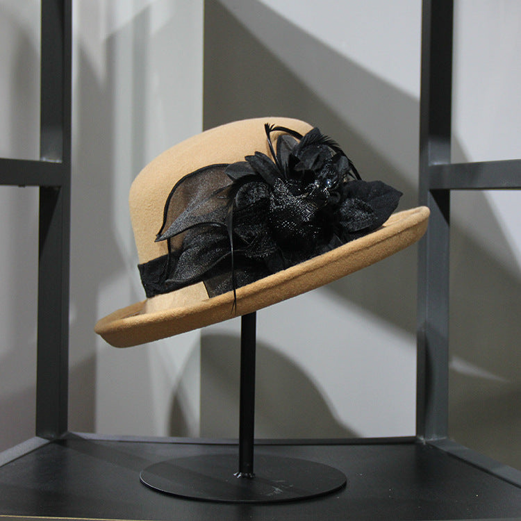 Fashion elegant bowler hat in autumn and winter Women's woolen pot hat Feather mesh flower felt hat