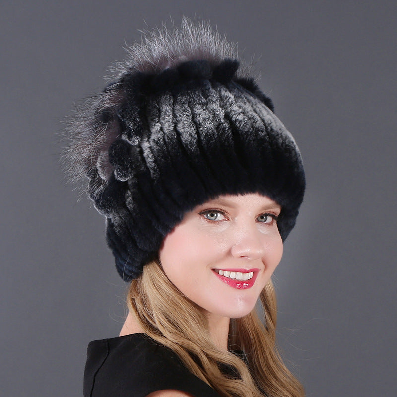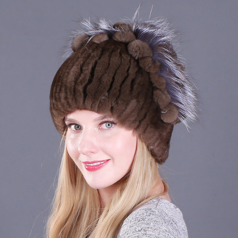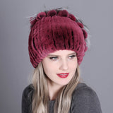 Women's winter warm fashion thickened wool hat Rex rabbit fur hat knitted with side flower hat